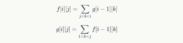 设 f(i,j) 表示前i个数的排列中,第一个数是第 j 大,且a1>a2的方案数, g(i,j) 表示前i个数的排列中,第一个数是第 j 大,且a1<a2的方案数。