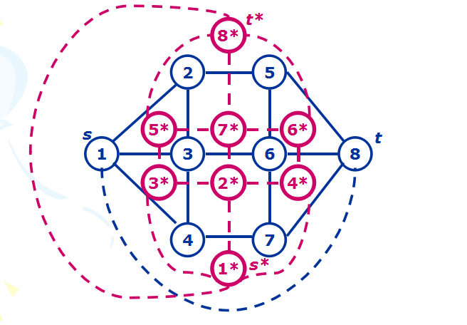 大致是将原平面图的每个面作为对偶图的一个点,每条边变为连接左右两个面的边,那么对偶图中的一个环就对应原图的一个割(相当于把几个点切下来)。给定源汇点后,在平面图从s向t连一条长为inf的边,这条边与原边会形成一个面,对应对偶图中的一个点。从这个面走到平面图的外面(即面积为inf的那个面),相当于平面图的一个割。对应到对偶图上,相当于两个面所对应点的路径。只需求出两个点之间的最短路,就得到了平面图的最小割。从而就可以在O((n+m)logn)的时间内解决这道题。