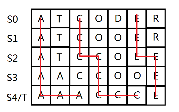 从右到左依次确定。每确定一个对应关系就相当于从\(T\)引一条折线到\(S_0\),这条折线只能向上向左,且不能和其它折线相交。